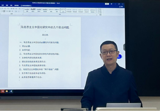 讲座伊始,赵教授聚焦马克思主义中国化的必要性与可能性问题,深入剖析并强调,马克思主义中国化并非空中楼阁,而是有着坚实的实践基础与理论支撑,既是中国历史发展的必然选择,也是解决中国现实问题的关键所在。尔后,赵教授深入探讨了马克思主义中国化的主体性与原创性问题,创新性地提出了广义原创概念。最后,针对马克思主义中国化中的“两个结合”问题,赵教授以辩证系统思维为导向,构建了“结合”理论的分析框架。他指出,“结合”不是外在拼接,而是马克思主义基本原理与中国具体实际、中华优秀传统文化之间的双向需要与成就。