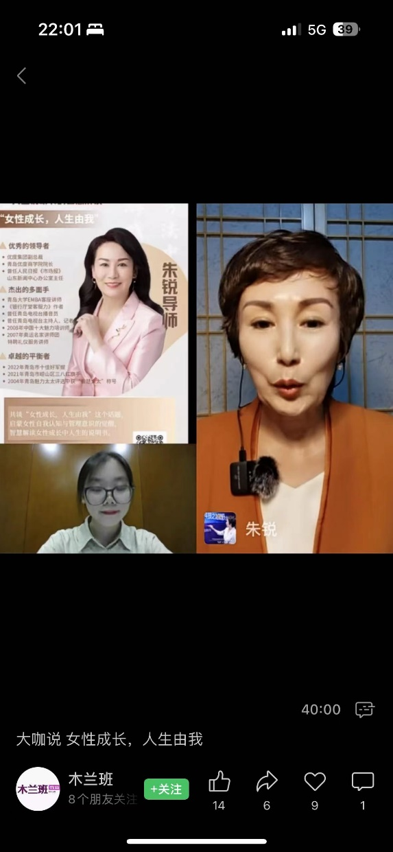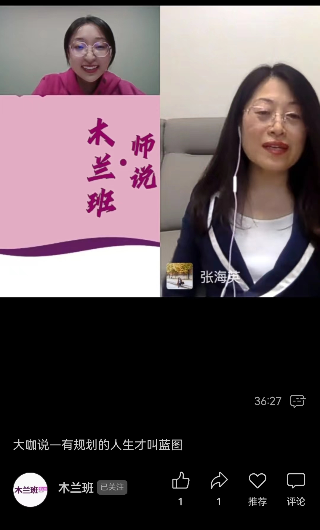 “木兰班”以中国古代女将军花木兰为象征,寓意着大学女生将成为未来的战士和领袖,勇敢地面对挑战,在为家、国的奋斗和个人的发展中都取得优秀的成绩。前三次的直播访谈活动使同学们受益匪浅,学到很多知识和经验。让我们期待以后的访谈活动!