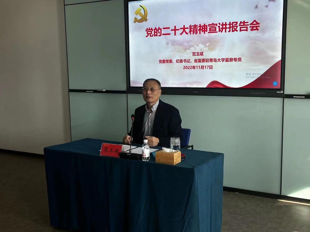 在报告中,范玉斌首先强调,要深刻学习领悟党的二十大精神的重要意义,尽快把思想和行动统一到大会精神上来。随后,范玉斌从“明主题”:深刻学习领悟党的二十大主题,高举伟大旗帜,牢记初心使命;“悟成就”:深刻学习领悟过去五年工作和新时代十年伟大变革的重大意义,坚持历史自信,增强历史主动;“懂意义”:深刻学习领悟两个确立的决定性意义,坚决捍卫两个确立,坚决做到两个维护;“有方法”:深刻学习领悟习近平新时代中国特色社会主义思想的世界观和方法论,凝心铸魂固本,深学细悟笃行;“知使命”:深刻学习领悟以中国式现代化全面推进中华民族伟大复兴的使命任务,明确发展方向路径,努力奋勇前行;“严要求”:深刻学习领悟以伟大自我革命引领伟大社会革命的重要要求,坚持严的基调,正风肃纪反腐等六大方面,对党的二十大精神作了系统宣讲和全面阐释。