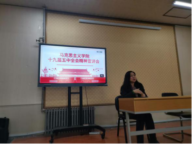 的老师们处在意识形态教育的前沿阵地,更要坚持马克思主义在意识形态的领导地位。随后,曲新英教授就新发展理念谈了自己的理解,她认为包含五个新的组成部分,即新的奋斗目标、文化支撑、价值内核、发展动力及发展事业,并从政治、经济等方面阐释了人民至上理念。最后,谢春玲教授从背景、定位及做法等方面对新发展格局谈了自己的体会。