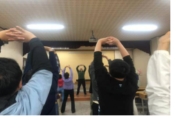 的老师们于笃行楼205室一起学习健身气功“八段锦”。
