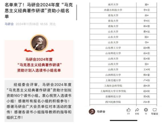2024级硕士研究生李万红等人申报了“《习近平著作选读》读书小组”(成员有宫程程、庞霖、李亚萌、王团、于莉、刘诗垚、李雪,指导老师郭金鸿),2024级硕士研究生孙昊等人申报了“《共产党宣言》读书小组”(成员有王新宇、尹潇萌、刘雨萌、张照阳,指导老师赵俊林、孙振),他们认真准备并按时提交材料,终于获得立项资助!