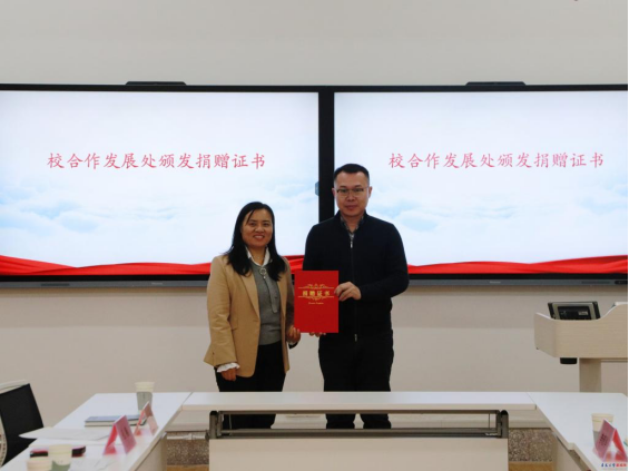 青岛大学教育发展基金会副秘书长孔燕向海信商显股份有限公司颁发捐赠证书。