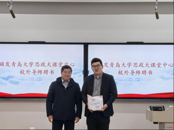 仪式上,吴世珍为刘杰颁发青岛大学思政大课堂中心校外导师聘书。