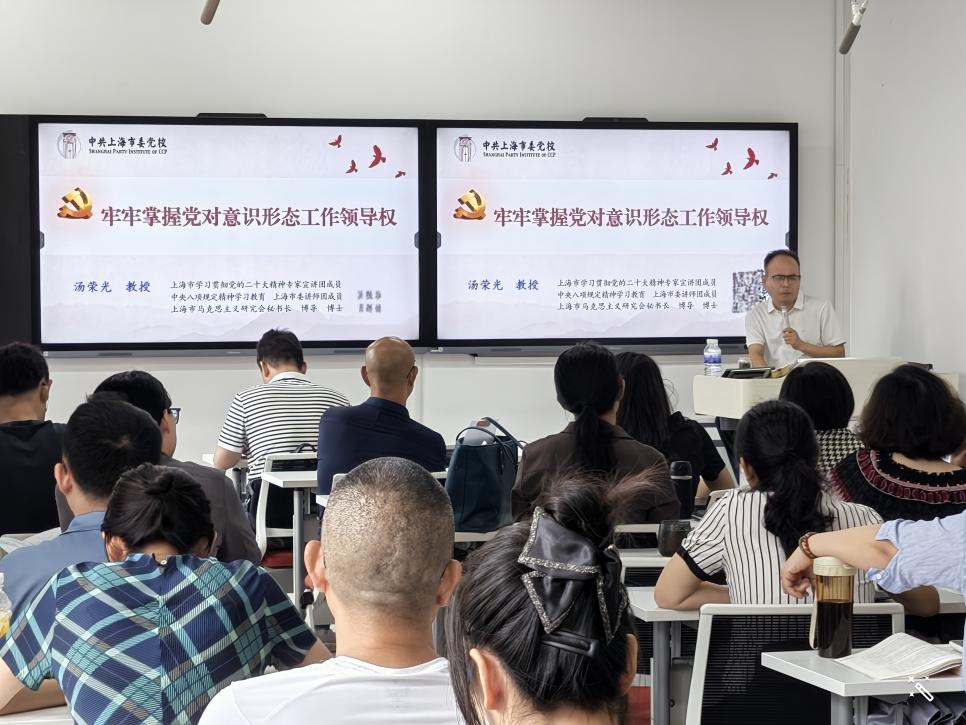 上午,在简短而庄重的开班仪式后,上海市马克思主义研究会秘书长、上海市委党校汤荣光教授带来首场专题讲座《牢牢掌握党对意识形态工作领导权》。汤教授凭借其深厚的理论造诣和在中央宣传部门的丰富实践经验,深刻阐释了意识形态工作的极端重要性,为全体教师在新形势下如何坚定政治立场、提升政治能力提供了高屋建瓴的指导。