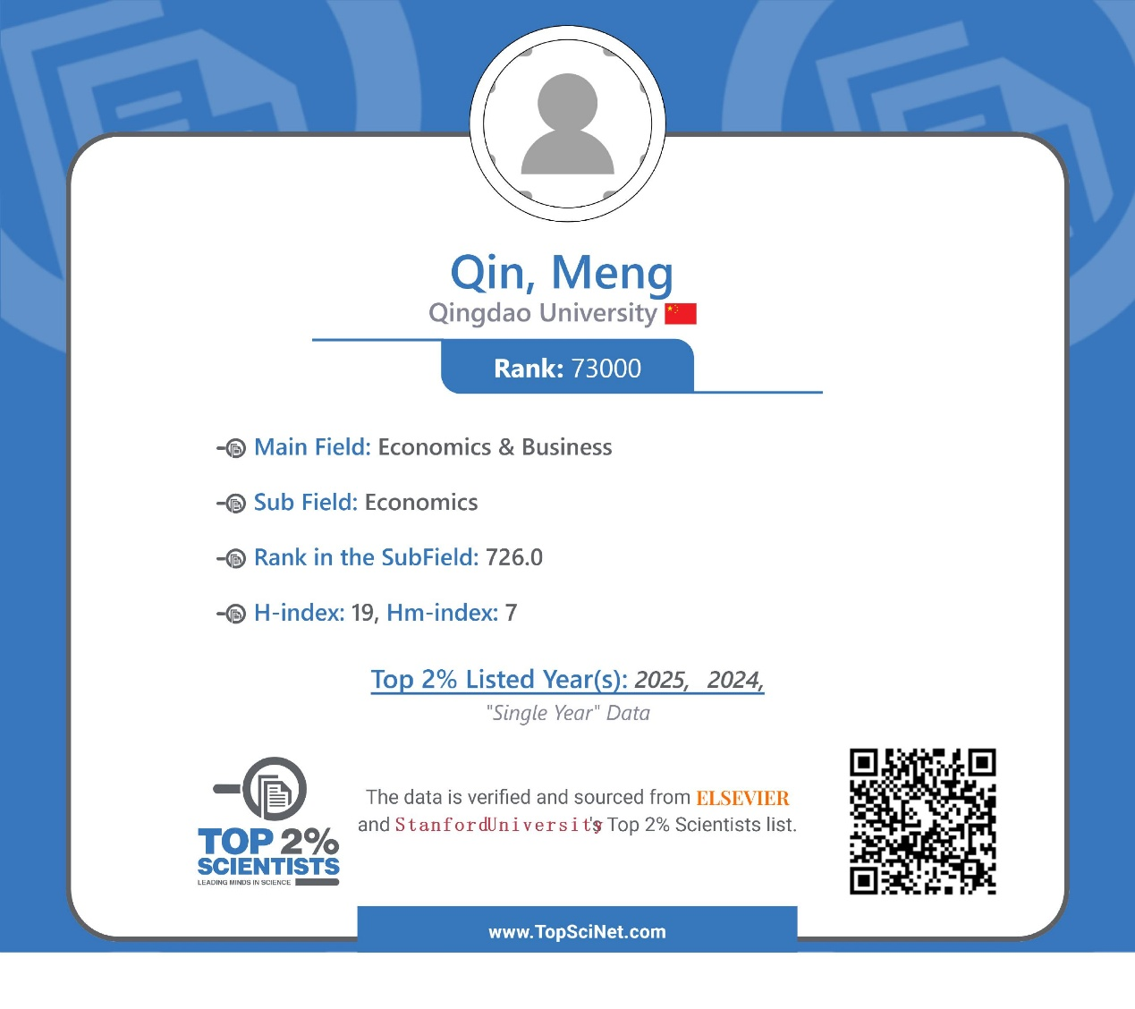 秦梦副教授再次入选榜单,位列全球经济学子学科排名726位(总31685人),与2024年排名1804位(总47525人)相比有大幅提升,实现合法赌博网站