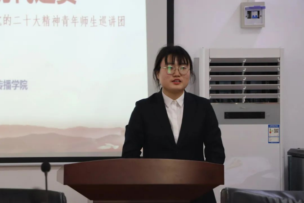 2020级汉语言文学专业本科生谷丽林以《以青年之名,担时代之责》为题,从认识党的二十大的重大意义、高举中国特色社会主义伟大旗帜、争做新时代“四有”好青年、未来属于青年希望寄予青年四个方面进行分享交流,并结合自身的学生工作经历和实践经验,鼓励大家肩负起时代的重任。