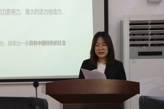 “笃行宣讲团”成员、2022级思想政治教育专业硕士研究生李佳怡以《坚定文化自信,践行文化担当》为题,从文化自信的理论内涵、文化自信的底气来源、为何要坚定文化自信、如何坚定文化自信四个方面进行分享,并提出作为大学生的我们应强化专业课的学习,积极参加课外实践活动,为坚定中华民族文化自信贡献青春力量。