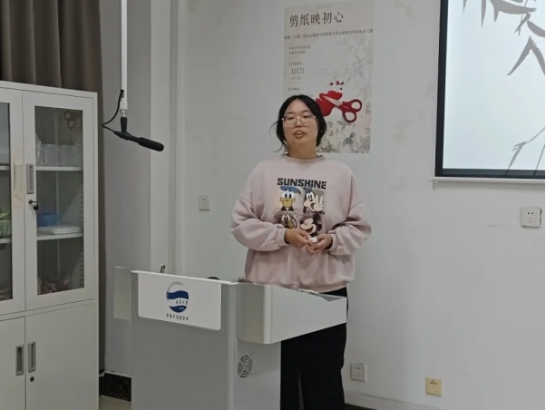 优秀学生代表古瑞阳、蔺意茹、李如意纷纷上台分享她们在剪纸过程中对于习近平新时代中国特色社会主义思想中物质文明和精神文明相协调的深刻见解和认识。首先,古瑞阳从四个方面解读了物质文明建设的部署,分别是:党的领导,人与自然和谐共生,人民民生,法制建设;随后,蔺意茹解读了精神文明建设的部署,分享了加强精神建设的措施;最后,李如意分享了她的剪纸文化体验,并带领同学们亲自动手开始剪纸的制作。